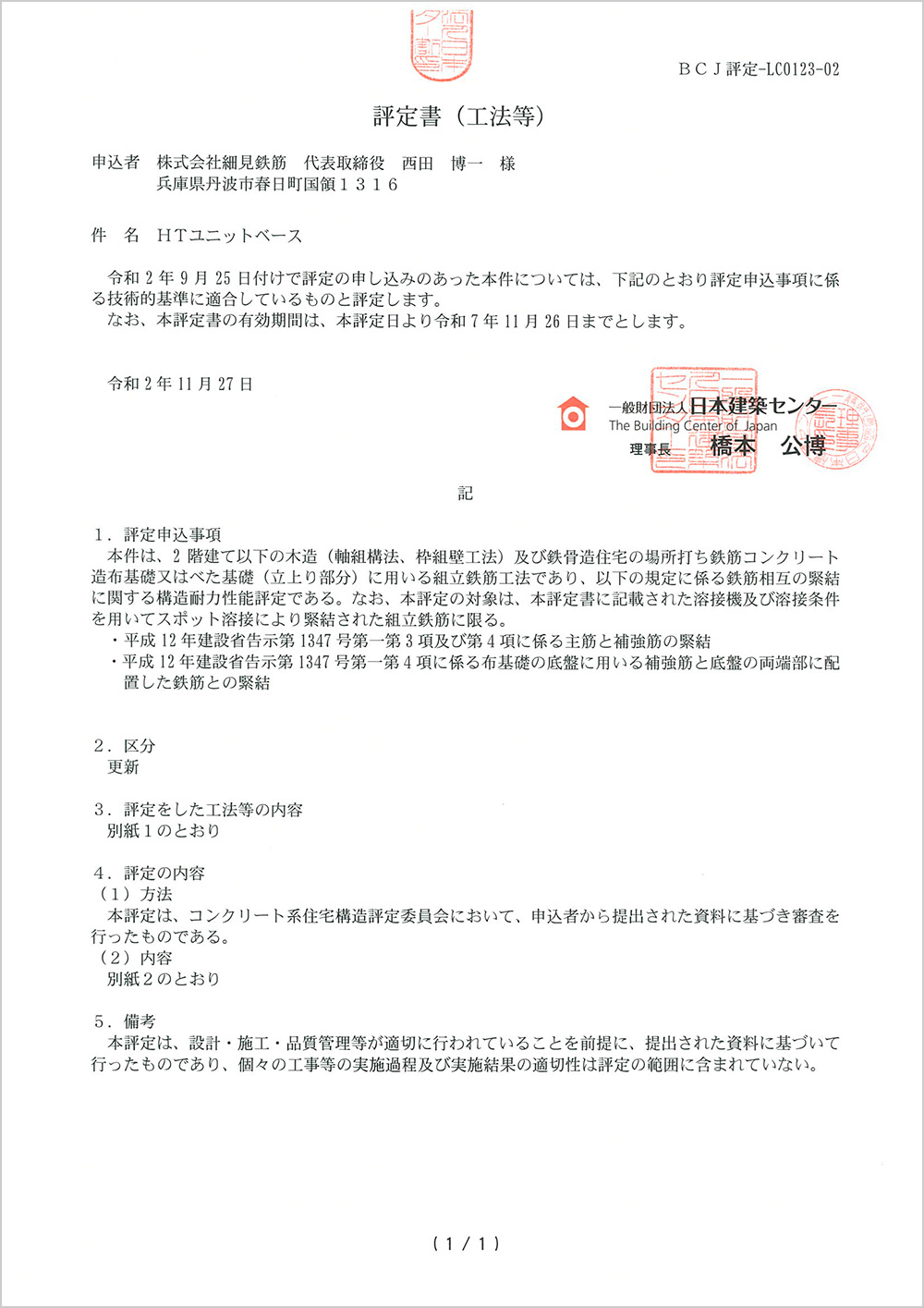 本件は、2階建て以下木造(軸組構法、枠組壁工法)及び鉄骨造住宅の場所打ち鉄筋コンクリート造布基礎又はべた基礎(立ち上り部分)に用いる組立鉄筋工法であり、以下の規定に係る鉄筋相互の緊結に関する構造耐力性能評価である。